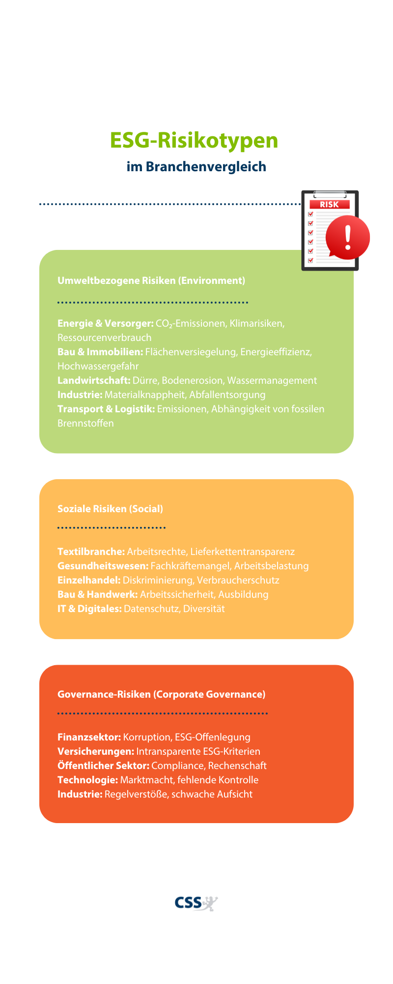 ESG-Risiken bezeichnen potenzielle negative Auswirkungen auf ein Unternehmen, die aus den Bereichen Environment (Umwelt), Social (Soziales) und Governance (UnternehmensfĂĽhrung) resultieren.